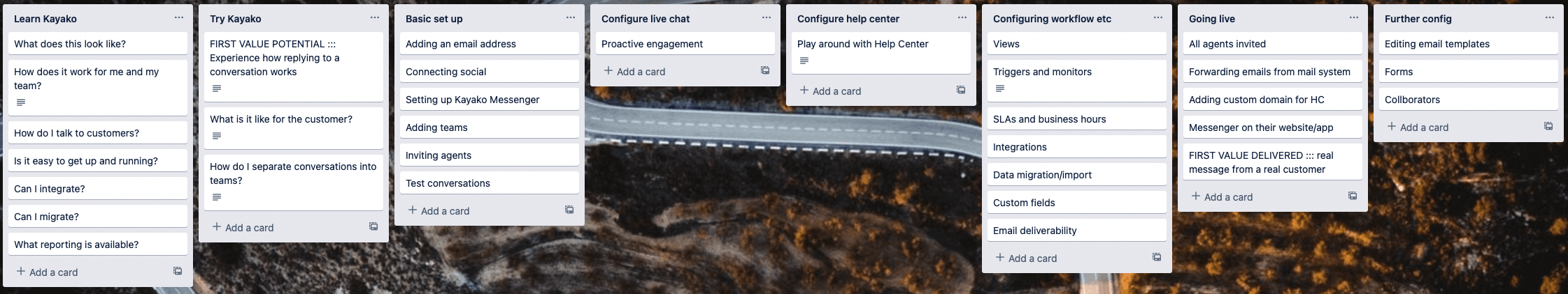 As well as interviews, we used Fullstory to watch sessions of successful users in the product who converted. From here, we created a simple Trello board – what I now know is a basic job-to-be-done map! – that detailed the questions and tasks they would complete.