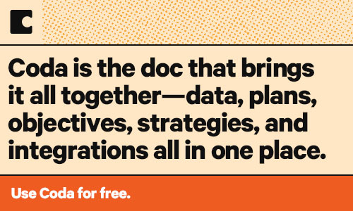 When work is spread out across documents, spreadsheets, and a stack of workflow tools, it makes it harder to collaborate effectively. Coda is a flexible, buildable doc that can power your business. Bring your valuable data, plans, objectives, strategies, and integrations into a Coda doc to create the single source of truth you need.