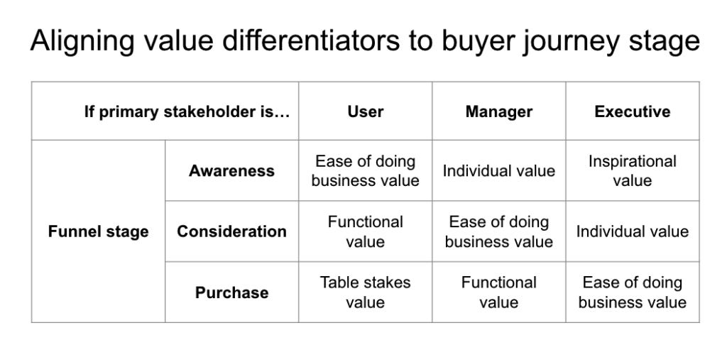 Just like your value proposition, you're going to find most success when you tailor the differentiators you use to two things: the primary stakeholder, and the buyer journey stage.