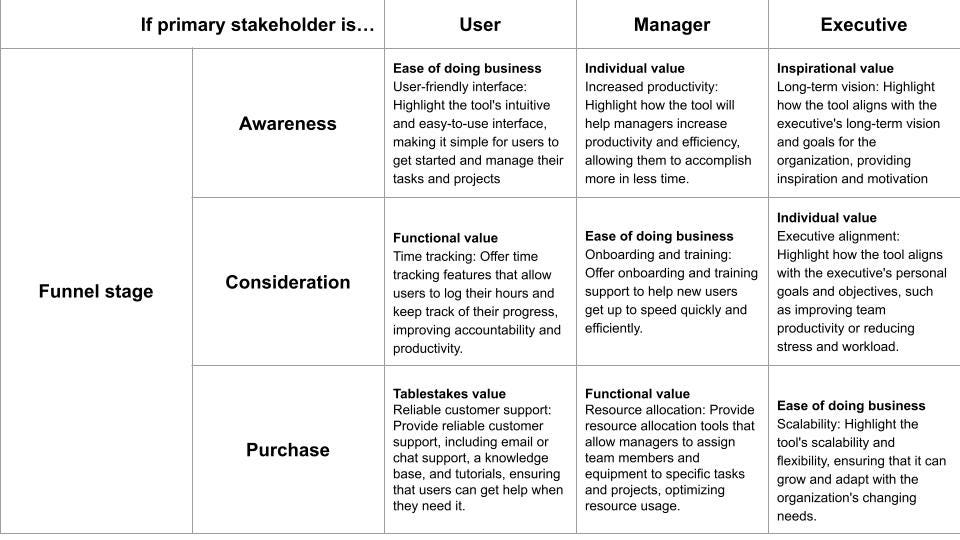 So if we combine both the primary stakeholder and the funnel stage, we get something like this: