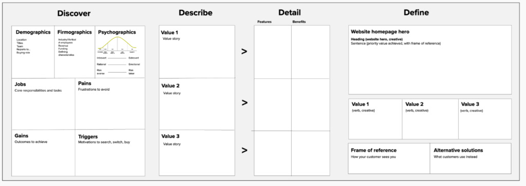 It's built to ensure that with the right inputs and the right questions asked, the outcome is the same: quality positioning that resonates with your customer, and showcases how your product supports them in obtaining the value they desire.