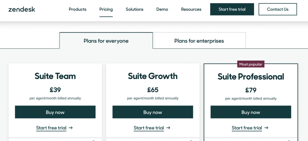 Take Zendesk's pricing page for example. They've highlighted their Suite Professional plan as an anchor, their highest page. Your eye is drawn there first. £79! Does that mean the £39 plan or the £65 plan is actually a great deal? I think so.