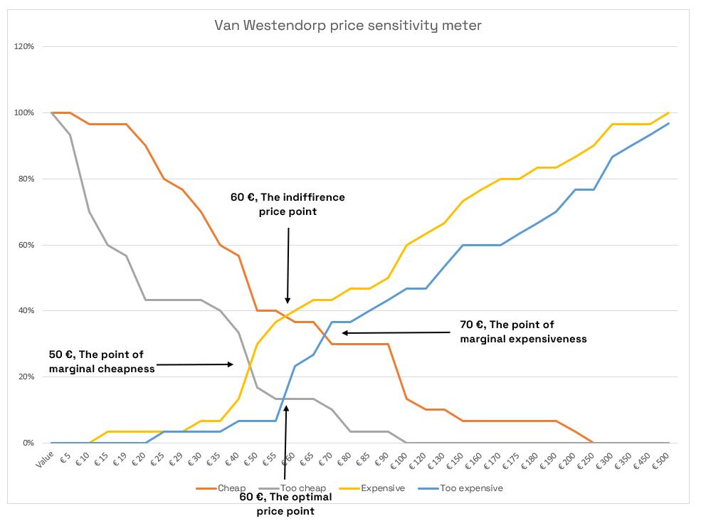 The output is a graph like this that tells you the highest and lowest acceptable prices, and the optimal price point - where the most people think pricing is neither too cheap or too expensive.