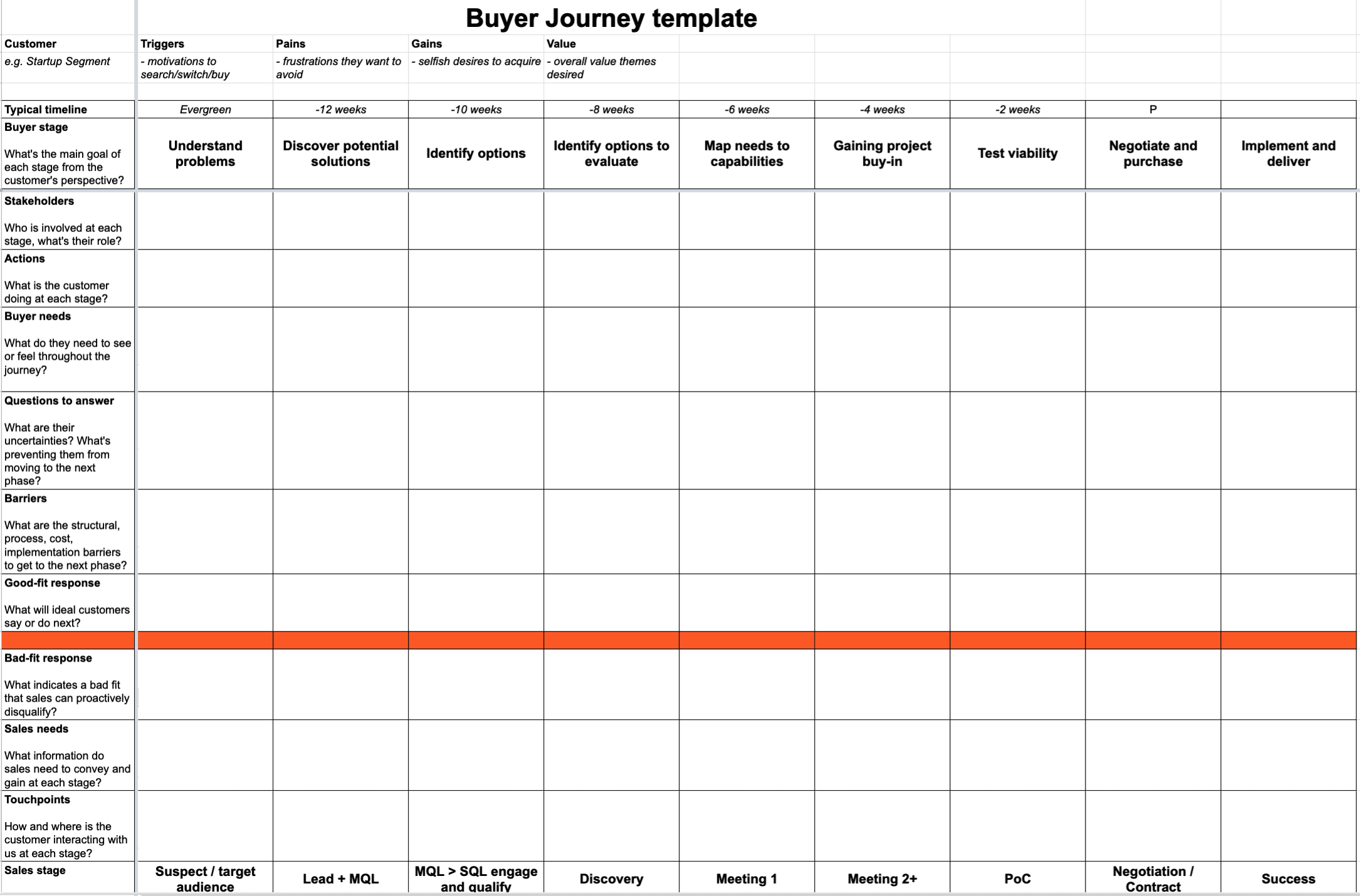 The buyer journey is well-documented, highlighting and prioritizing what they need the questions they ask at each stage in the process. This aligns with your internal sales process, mapped to stages in the funnel.