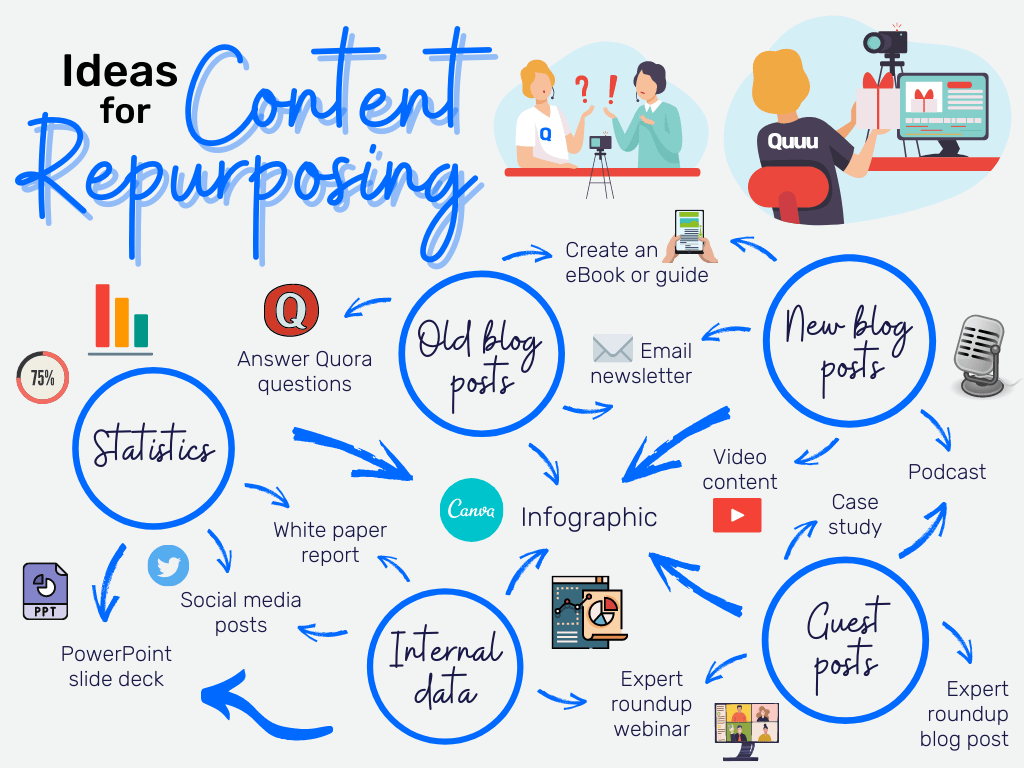 We can lean into the concept of content repurposing: create the base material once, reuse and reformat everywhere. Here's some examples: