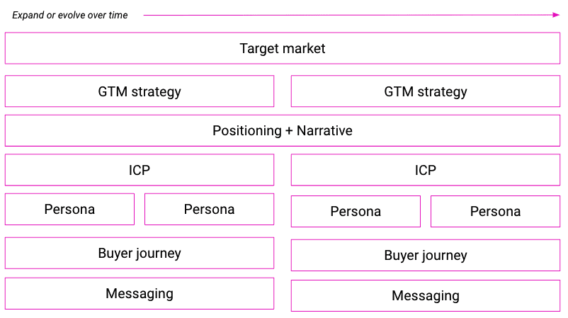 Over time, you'll either expand your ICP to include adjacent customers, add additional ICPs to cover new segments, or pivot completely to a new ICP as you learn about your product/market-fit. This might require new/additional buyer personas (and therefore buyer journeys and messaging), or different go-to-market motions (for example, adding a self-service GTM).